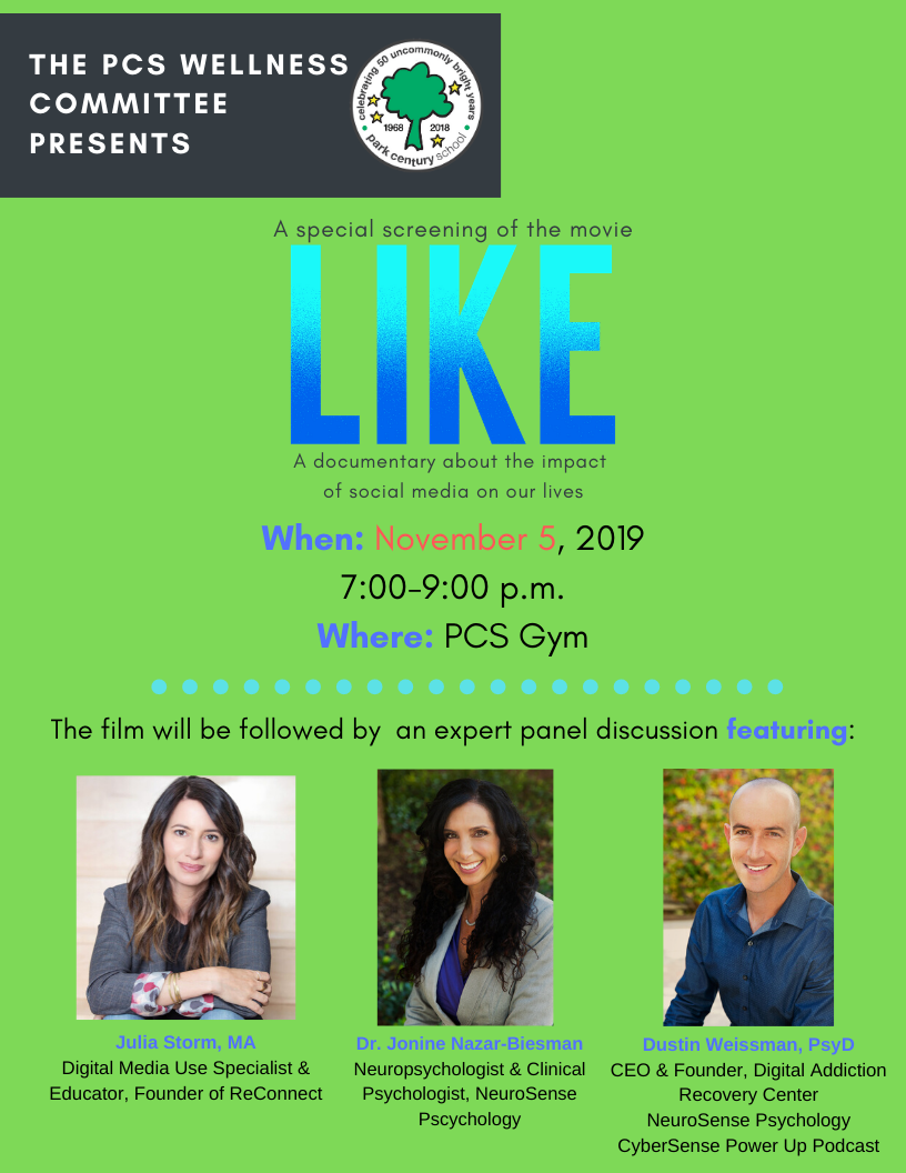 LIKE Screening and Expert Panel Rescheduled for Tuesday, November 5, 2019 Are you really using technology, or is technology using you?Our PCS Wellness Committee invites parents, educators, and friends from the community to attend a special screening of the movie LIKE. The film, a thought-provoking and timely documentary about the impact social media has on our lives, aims to inspire people of all ages, especially kids, to self-regulate their time on social media. The film screening will be followed by a discussion led by the below experts.LIKE Screening and Expert Panel DiscussionWhen: Tuesday, November 5Where: PCS GymnasiumFREE and open to the public**We are currently at capacity.Please email pcs@parkcenturyschool.org if you'd like to be added to our waitlist.**
